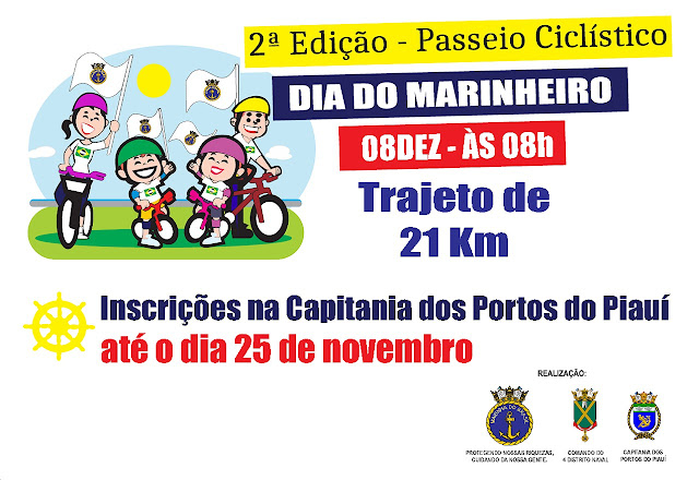 O Capitão de Fragata Dante, Capitão dos Portos do Piauí falou que as inscrições estão abertas para o passeio ciclístico. “Para efetuarem as inscrições os interessados devem procurar a Capitania dos Portos com 1 kg de alimento não perecível, exceto sal, e mais 1 litro/kg de produto de limpeza. Podem participar pessoas de ambos os sexos, acima de 12 anos. Os menores de idade deverão ter suas inscrições feitas pelos pais e/ou responsáveis, que obrigatoriamente deverão também estar inscritos e acompanhar o menor durante todo o trajeto”, disse o Capitão.