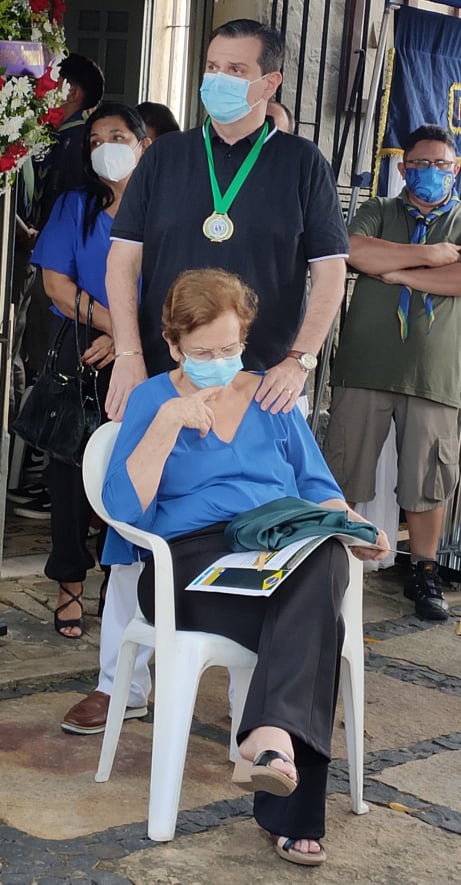 | A esposa do Dr. Renato, Cândida Bacellar, amparada pelo filho Raul Neto |